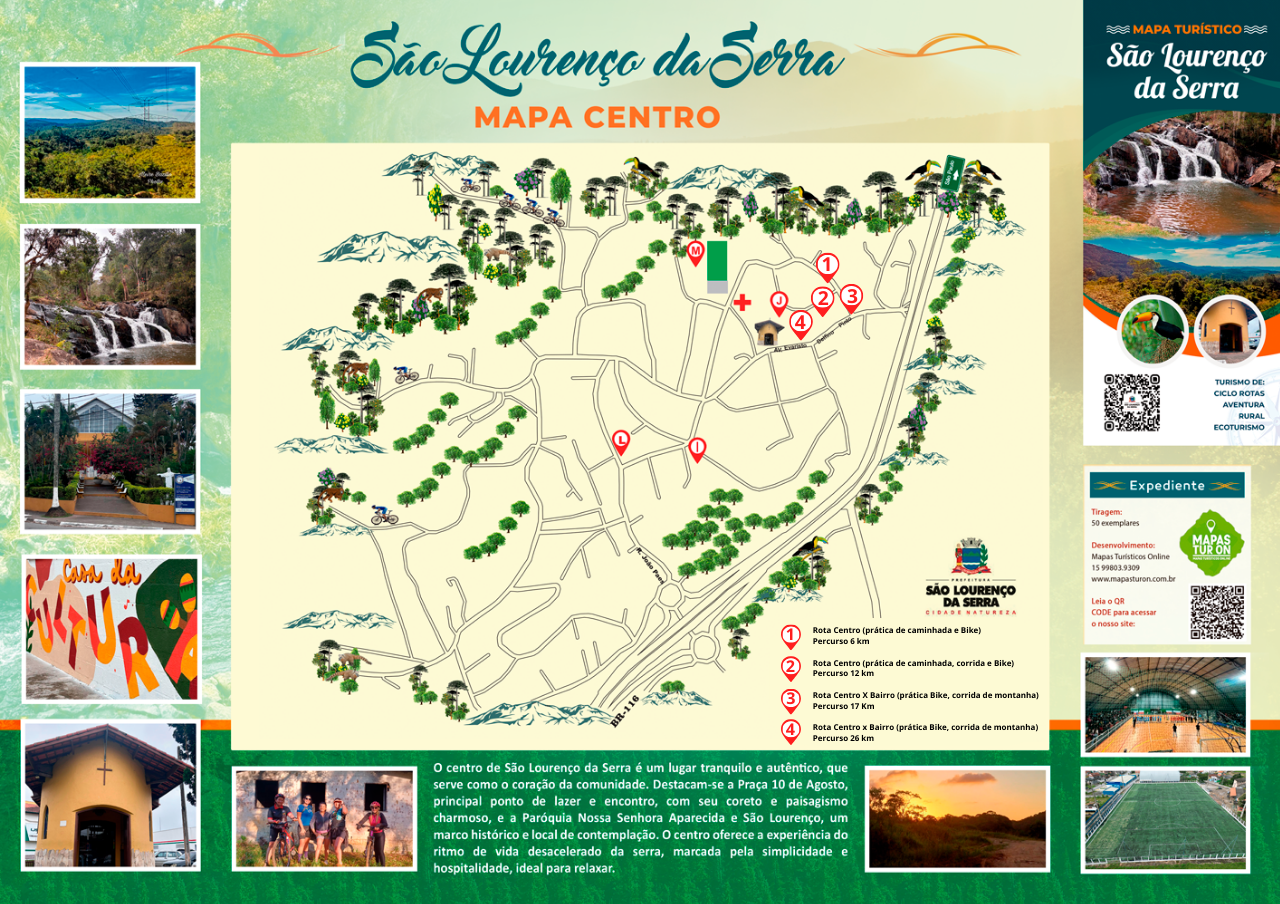 O centro de São Lourenço da Serra é um lugar tranquilo e autêntico, que serve como o coração da comunidade. Destacam-se a Praça 10 de Agosto, principal ponto de lazer e encontro, com seu coreto e paisagismo charmoso, e a Paróquia Nossa Senhora Aparecida e São Lourenço, um marco histórico e local de contemplação. O centro oferece a experiência do ritmo de vida desacelerado da serra, marcada pela simplicidade e hospitalidade, ideal para relaxar.